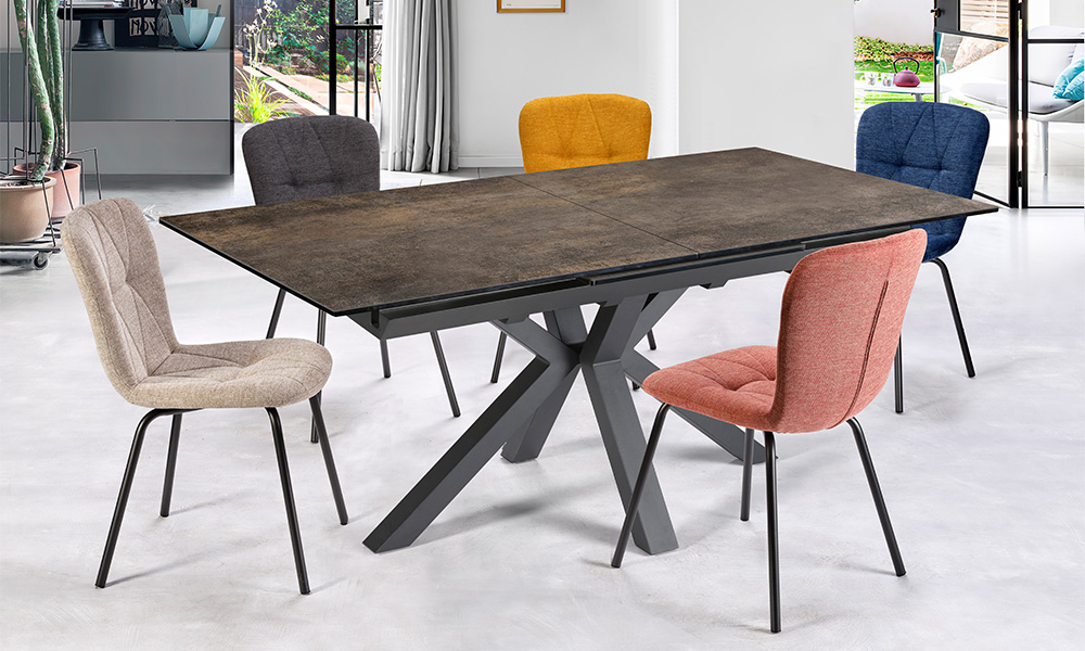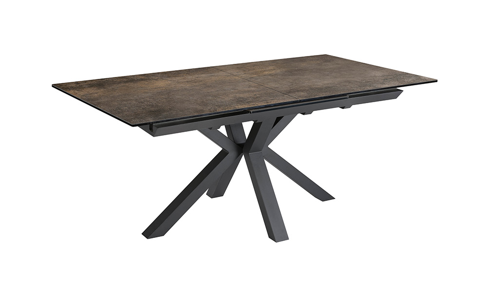 Plateau céramique collée sur un verre : épaisseur 13mm. Piètement fer finition époxy gris anthracite. Pieds en croix